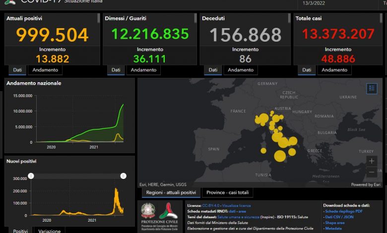 Nelle ultime 24 ore sono stati 86 i decessi (ieri 133), che portano il totale di vittime da inizio pandemia a 156.868. Con quelli di oggi diventano 13.373.207 i casi totali di Covid in Italia. Attualmente i positivi sono 999.504 (+13.882), 990.748 le persone in isolamento domiciliare. I ricoverati in ospedale con sintomi sono 8240 di cui 516 in Terapia intensiva. I dimessi/guariti sono 12.216.835 con un incremento di 36.111 unità nelle ultime 24 ore.