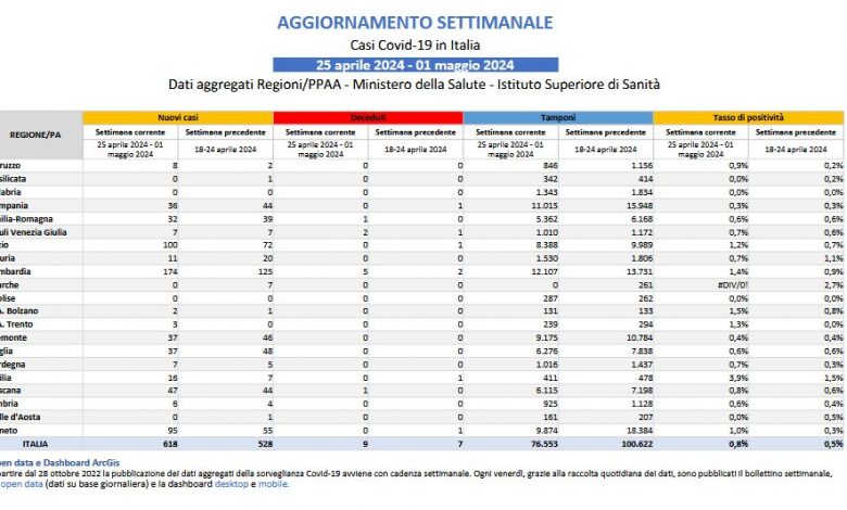 ROMA (ITALPRESS) – Lieve aumento dei casi e del tasso di positività. Lo rileva il bollettino Covid del ministero della Salute riferito alla settimana 25 aprile – 1 maggio 2024. Si registrano: 618 nuovi casi positivi con una variazione di +17,0% rispetto alla settimana precedente (n: 528), 9 deceduti con una variazione di +28,6% rispetto alla settimana precedente (n: 7), 76.553 tamponi effettuati con una variazione di -23,9% rispetto alla settimana precedente (n: 100.622).