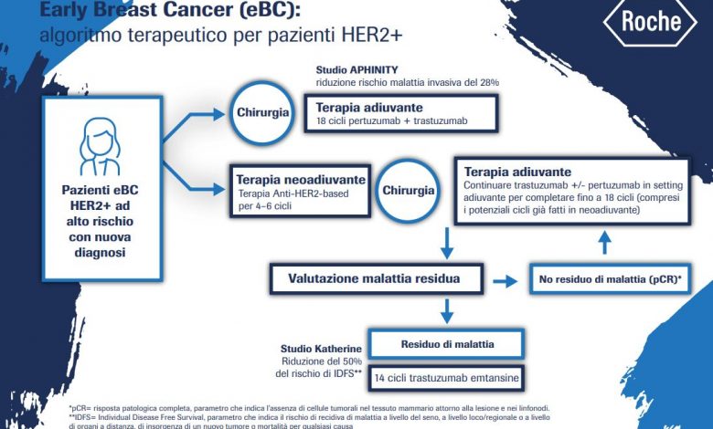 MONZA (ITALPRESS) – Offrire a tutte le pazienti la migliore terapia possibile, assicurare le migliori cure secondo le caratteristiche della malattia. Un bisogno fortemente sentito da medici e pazienti, che oggi trova una nuova risposta grazie alla disponibilità di due nuove molecole che si inseriscono, rivoluzionandolo, nel percorso terapeutico del tumore alla mammella HER2 positivo in stadio precoce. Le due molecole sono trastuzumab emtansine (TDM-1) e pertuzumab, entrambi inibitori di HER2, frutto della ricerca Roche: il primo è indicato nelle pazienti con residuo di malattia dopo terapia neoadiuvante seguita da chirurgia; il secondo nelle pazienti ad alto rischio con coinvolgimento linfonodale che hanno effettuato chirurgia al momento della diagnosi (non preceduta da terapia neoadiuvante).