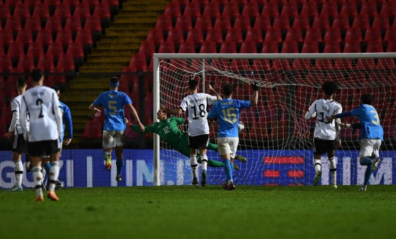 Un minuto dopo tentativo mancino degli avversari con Samardzic, palla larga. Il match si sblocca al 23′ grossa disattenzione della difesa azzurra, Huseinbasic riceve palla nel cuore dell’area azzurra, mette a sedere Carnesecchi e mette in rete. La squadra di Nicolato reagisce ancora con Colombo, ma il portiere della Germania è attento e devia. Nella ripresa blackout azzurro con i tedeschi che mettono a segno due reti in tre minuti: al 52′ con una precisa punizione dai 25 metri di Samardzic (di proprietà dell’Udinese) e al 55′ con un destro secco di Schade da poco dentro l’area. L’Italia non ci sta e al 66′ accorcia con l’attaccante della Lazio Cancellieri, che controlla un pallone in area e batte Atubolu. Al 74′ è ancora Cancellieri, questa volta con un violento sinistro, ad accorciare sul 3-2. Nel finale espulsi Cittadini e Bellanova e poker tedesco con un rigore di Malone. Vince la Germania, Italia battuta 4-2.