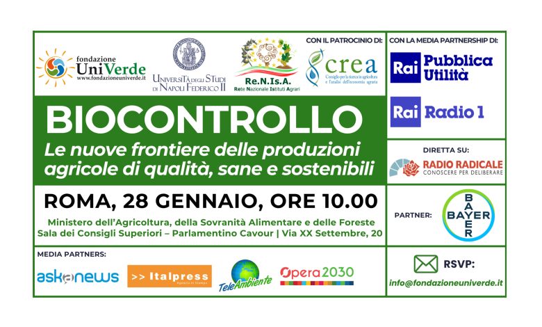 Questo il tema che sarà approfondito al convegno “Biocontrollo. Le nuove frontiere delle produzioni agricole di qualità, sane e sostenibili” – promosso da Fondazione UniVerde, Università degli Studi di Napoli Federico II e Rete Nazionale Istituti Agrari – Re.N.Is.A. con il patrocinio del CREA (Consiglio per la ricerca in agricoltura e l’analisi dell’economia agraria) – che si terrà a Roma, mercoledì 28 gennaio 2026, ore 10:00, presso il Parlamentino Cavour del Ministero dell’Agricoltura, della Sovranità Alimentare e delle Foreste (Via XX settembre, 20) con la media partnership di Rai Pubblica Utilità e Rai Radio 1 e in diretta streaming su Radio Radicale e con la partnership di Bayer.