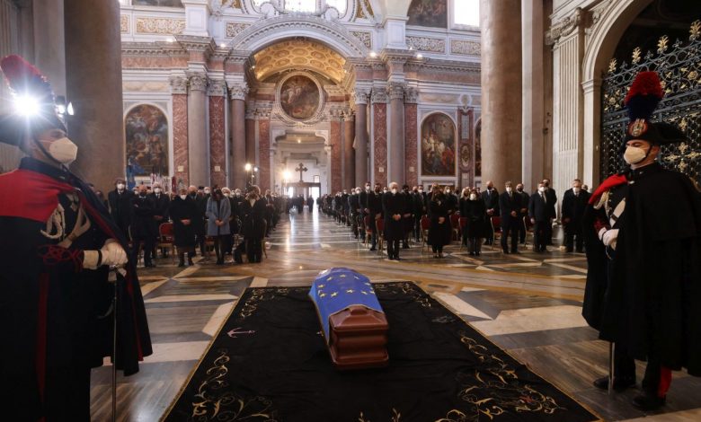 Il feretro, sul quale campeggiava la bandiera dell’Unione Europea, è stato ricevuto con il picchetto d’onore, alla presenza, tra gli altri, del presidente della Repubblica italiana Sergio Mattarella, e le istituzioni Ue: la presidente ad interim del Parlamento europeo Roberta Metsola, il presidente del Consiglio europeo Charles Michel, la presidente della Commissione Ursula Von der Leyen, il commissario europeo all’Economia Paolo Gentiloni.