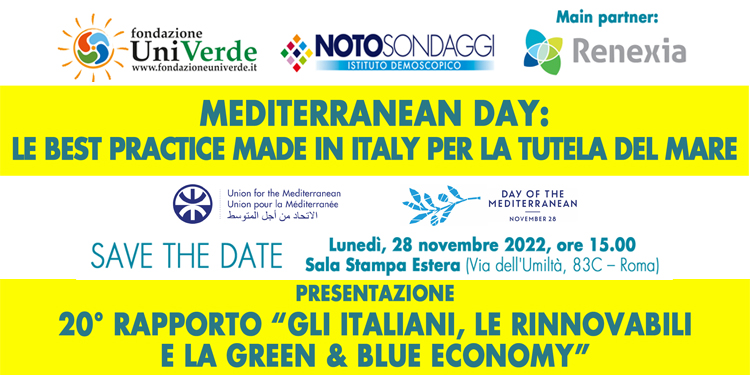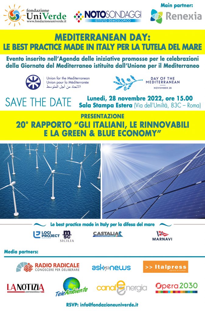 Si svolgerà a Roma, lunedì 28 novembre, alle ore 15:00, presso la Sala della Stampa Estera (Via dell’Umiltà, 83C), il convegno di presentazione del 20° Rapporto “Gli italiani, le rinnovabili e la green & blue economy” dal titolo “Mediterranean Day: le best practice Made in Italy per la tutela del mare”. L’evento, inserito nell’Agenda delle iniziative promosse per le celebrazioni della Giornata del Mediterraneo istituita dall’Unione per il Mediterraneo, è promosso da Fondazione UniVerde, Noto Sondaggi, con la Main partnership di Renexia.