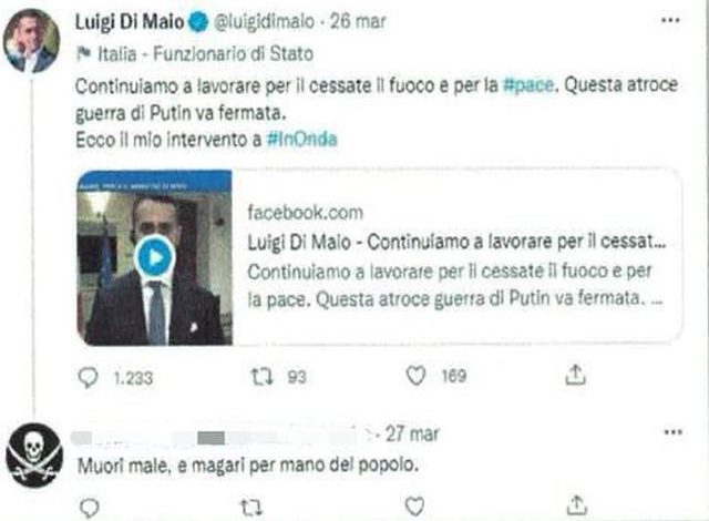 In particolare, in seguito alla pubblicazione su Twitter da parte del titolare della Farnesina di dichiarazioni in merito al confitto in atto, è stata riscontrata la presenza di vari messaggi di risposta del seguente tenore: “Muori male, e magari per mano del popolo”, “Si dai, armateci e decideremo poi a chi vogliamo sparare”, “Non ci sono parole per descrivere, vai solo buttato nel rusco”.