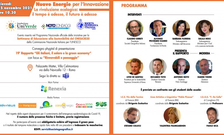 Serve quindi un’azione di stimolo immediata. Seguendo questi propositi sarà presentato giovedì 25 novembre, alle ore 10:30, il 19° Rapporto “Gli italiani, il solare e la green economy” al convegno phygital “Nuove Energie per l’Innovazione. La rivoluzione ecologica: il tempo è adesso, il futuro è adesso” promosso da Fondazione UniVerde, Noto Sondaggi e Società Geografica Italiana con la Main Partnership di Renexia.