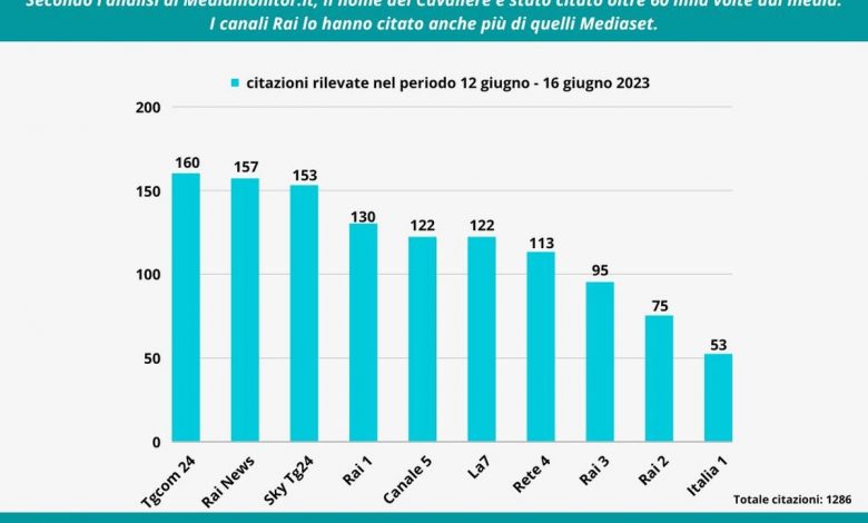 ROMA (ITALPRESS) – La morte e i funerali di Silvio Berlusconi hanno catalizzato l’attenzione dei media italiani e non solo: in 4 giorni, infatti, il nome del 4 volte Presidente del Consiglio dei ministri è stato scritto e pronunciato 60.318 volte, e 2.335 volte solo in radio e televisione ovvero ogni 2 minuti e mezzo. Lo rileva il monitoraggio sui principali media nazionali ed internazionali svolto da Mediamonitor.it, piattaforma che utilizza tecnologia e soluzioni sviluppate da Cedat 85, azienda attiva da oltre 35 anni nella fornitura dei contenuti provenienti dal parlato. Mediamonitor.it ha rilevato le citazioni relative a Silvio Berlusconi nel periodo che va dalle 9:30 di lunedì 12 giugno alle 9:30 di venerdì 16 giugno. Nel derby Rai-Mediaset sono le televisive pubbliche ad aver nominato di più l’ex Cavaliere: 457 citazioni nei 4 canali Rai (Rai 1, Rai 2, Rai 3, Rai News24) contro le 448 dei 4 canali Mediaset (Canale 5, Rete 4, Italia 1, TgCom24).