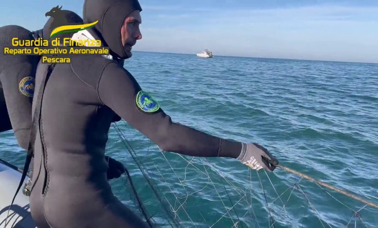 Nel corso di una crociera operativa lungo la Costa dei Trabocchi, le Fiamme Gialle di Pescara hanno individuato una rete da pesca posizionata in località Saraceni di Ortona (CH). Grazie alla presenza della componente subacquea del Corpo prontamente sopraggiunta, è stato possibile recuperare gli oltre 1.500 metri di rete saldamente ancorata al fondale e condurla in acque più sicure.