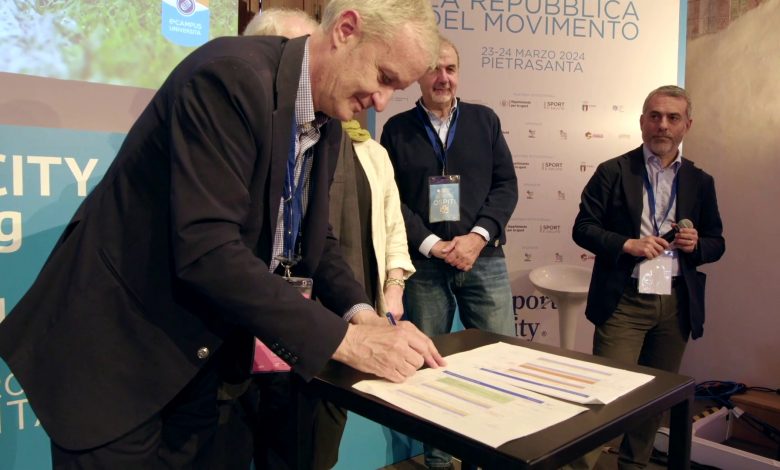 PIETRASANTA (ITALPRESS) – Il Chiostro di Sant’Agostino di Pietrasanta ha ospitato la seconda edizione dello “Sportcity Meeting con la presenza di oltre 150 amministratori di città italiane, esponenti del Parlamento, massimi dirigenti della governance dello sport italiano, manager di settore e nuovi stakeholders. Il tema dell’appuntamento era quello di fare rete per lanciare l’idea di una “Repubblica del Movimento”. Idea ripresa dai tanti protagonisti dei panel del meeting che durante la giornata si sono alternati sul palco, intervistati dal direttore di Rai Sport Iacopo Volpi. Durante il meeting le autorità e gli amministratori pubblici delle città italiane presenti hanno firmato la “Carta di Pietrasanta”, dichiarazione d’intenti per lo sviluppo delle sportcity sul territorio nazionale.