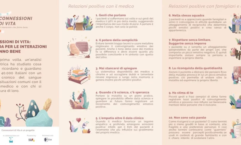 MILANO (ITALPRESS) – Cosa guarda, cosa ricorda e cosa prova chi convive con un tumore cronico del sangue? Gli occhi si soffermano sul volto e sui gesti del medico il 56% più della media, mentre resta impressa a lungo nella memoria la disponibilità dell’ematologo a chiarire anche i concetti più difficili. A generare invece intensi picchi emotivi, rilevati dal battito cardiaco e dalla sudorazione cutanea, è la capacità dei famigliari di distrarre il paziente dal pensiero fisso della malattia. A metterlo in luce è la prima analisi neurometrica sulle interazioni che i pazienti con Neoplasie Mieloproliferative Croniche e Leucemia Mieloide Cronica vivono con i loro medici, famigliari e amici. Proprio dai risultati dello studio – condotto dal centro di ricerca Behavior and Brain Lab dell’Università IULM di Milano – nasce “Connessioni di Vita. La guida per le interazioni che fanno bene”, promossa da Novartis, in collaborazione con AIPAMM, nell’ambito della campagna di informazione e sensibilizzazione MIELO-Spieghi. Un vademecum di utilità sociale per costruire relazioni positive e di qualità: infatti i piccoli gesti, le parole e le interazioni che gli oltre 40.000 pazienti italiani stabiliscono con i medici e con i loro cari hanno un impatto diretto sul loro benessere mentale e sono così in grado di fare la differenza nel percorso di malattia di un tumore del sangue dall’andamento cronico.