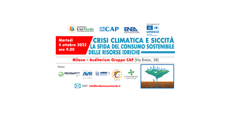 Si svolgerà a Milano, martedì 4 ottobre, ore 9:00, presso l’Auditorium Gruppo CAP (via Rimini, 38), il convegno “Crisi climatica e siccità: la sfida del consumo sostenibile delle risorse idriche. Istituzioni, imprese e società civile per la tutela delle risorse idriche e il diritto all’acqua” promosso da Fondazione UniVerde, Gruppo CAP, ENEA con il patrocinio di UNESCO WWAP – World Water Assessment Programme.